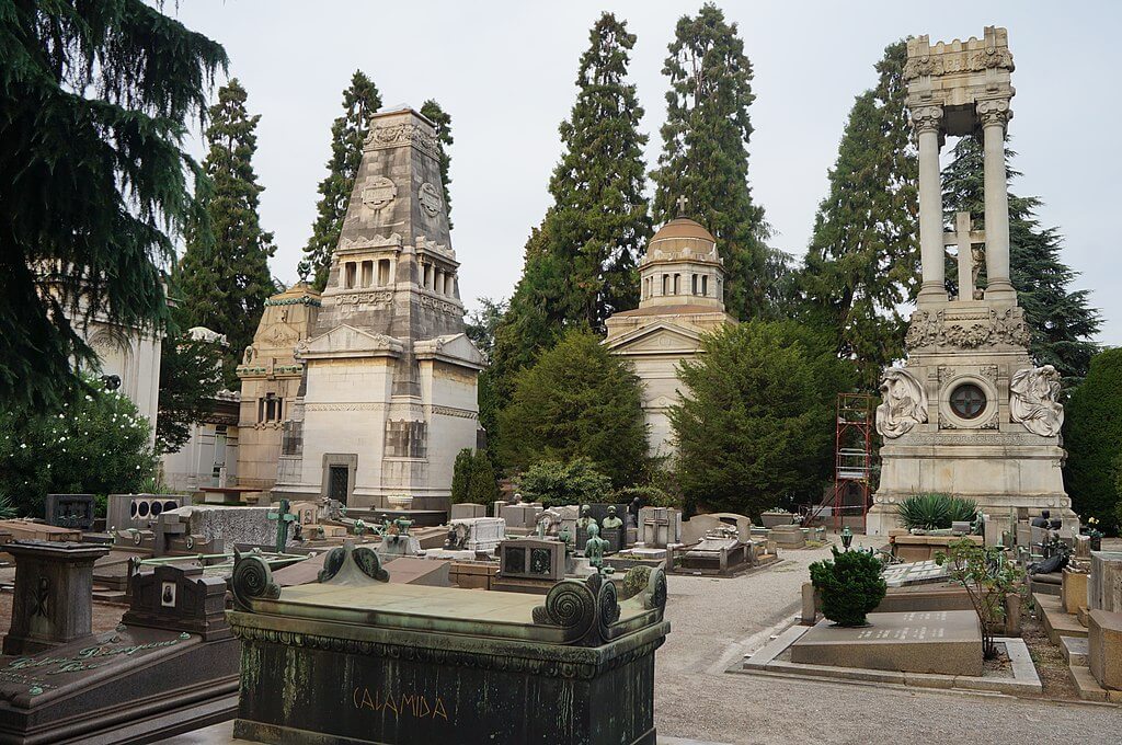 Nous vous conseillons de prendre en photo le plan du cimetière à l’entrée pour ne pas vous perdre. Essayez de trouver des tombes inhabituelles : la crypte de Davide Campari, dirigeant d’une entreprise de boissons alcoolisées, à l’entrée de laquelle est installée une version en pierre de la Cène. Ou encore le monument en forme de cube de verre sur la tombe du prêtre Luigi Giussani.